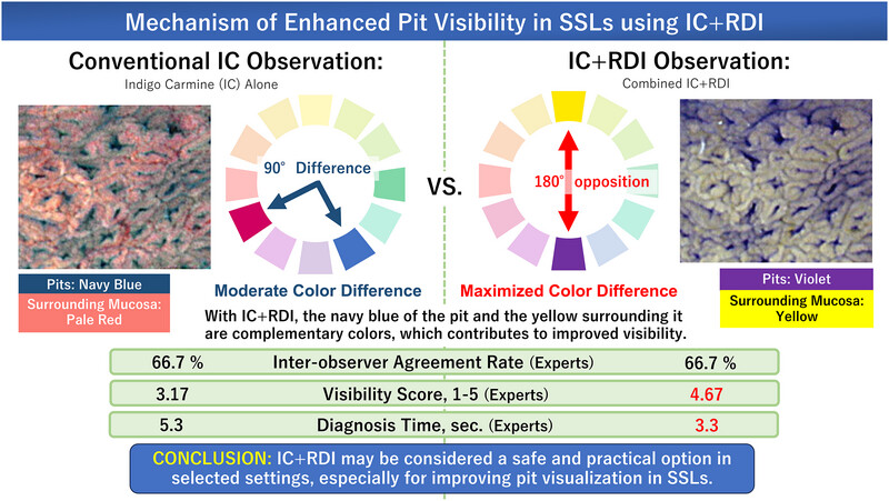 齋藤潤信先生(大学院生)の論文が、DEN Openに掲載されました。大腸腫瘍の質的診断では、拡大内視鏡と色素散布によるpit pattern診断が重要ですが、クリスタルバイオレット染色は手技が煩雑であり、日常診療での実施には一定のハードルがあります。本研究では、インジゴカルミン散布にRed Dichromatic Imaging(RDI)を併用することでpit patternの視認性を向上できるかを検討しました。その結果、IC+RDI観察は通常のインジゴカルミン観察と比較してpit構造の視認性を改善する可能性が示され、特に鋸歯状病変において有用である可能性が示唆されました。今後、pit pattern観察の簡便な方法として、日常診療での活用が期待されます。